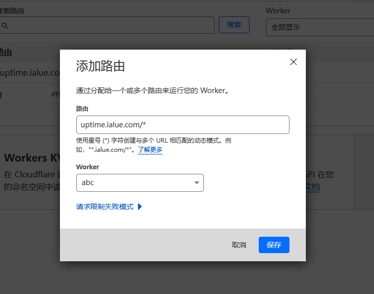 输入分配的域名,记得在域名后面加上/*,选择worker,点击保存